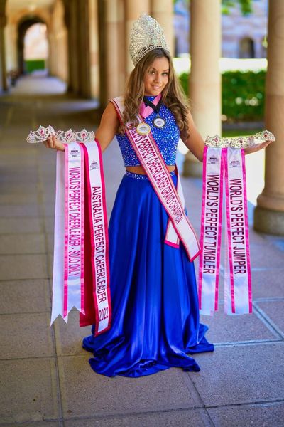To qualify for World's Perfect Cheerleader—School Grand Champion, you must compete in the main solo, evening wear, perfect tumbler, and perfect jumper. Those scores are added together, and the highest overall score will win this title no matter age or level.